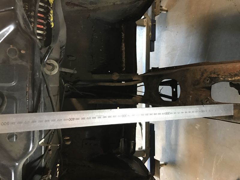 The top of the tunnel at the rear is 116mm from the top of the heel panel flange (if this is original). I can get you the distance from other reference points if this is a drama.
