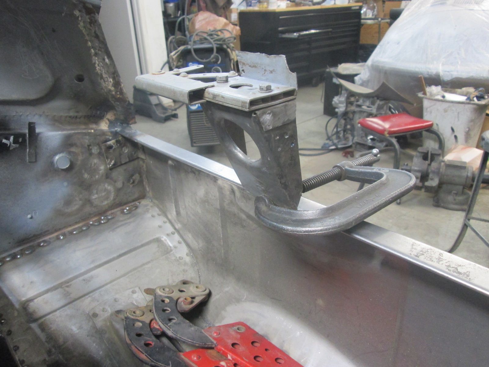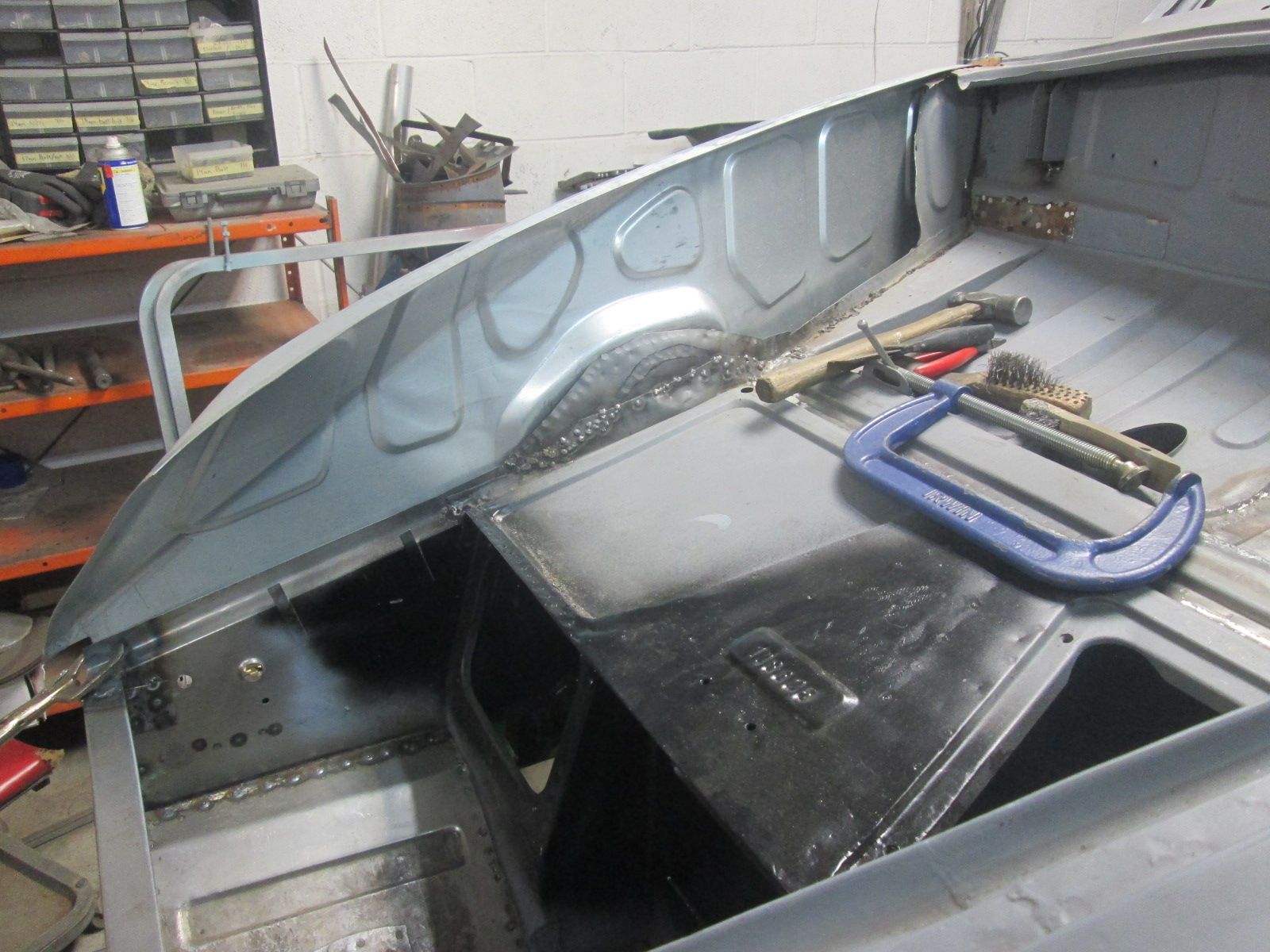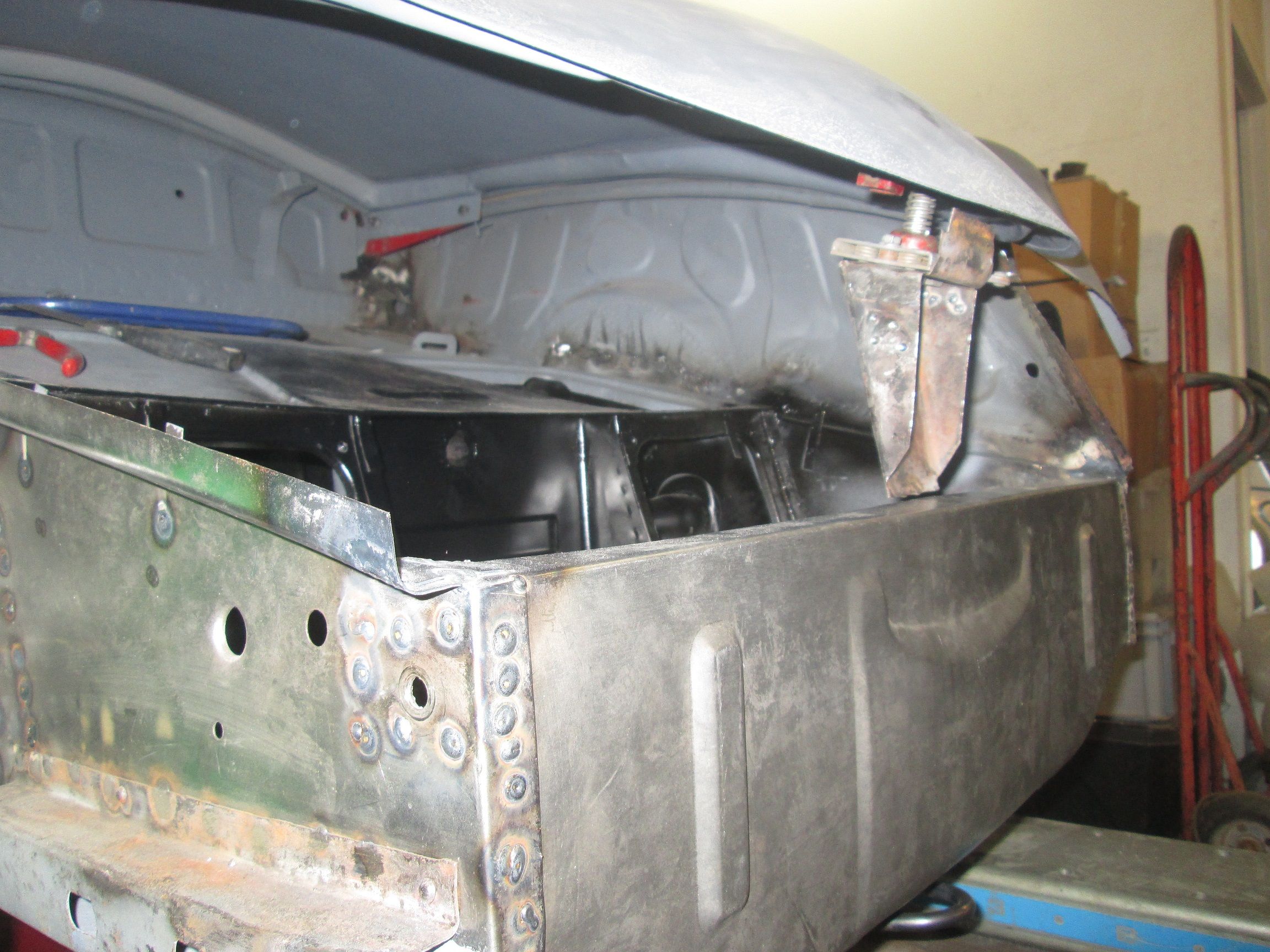 Click image for larger version  Name:	IMG_0447.jpg Views:	3 Size:	535.8 KB ID:	114269 One last piece left. A lot of welding to clean up in here as it was a bit awkward to lean in and weld reaching up. I sure miss this thing being on a rotisserie!
