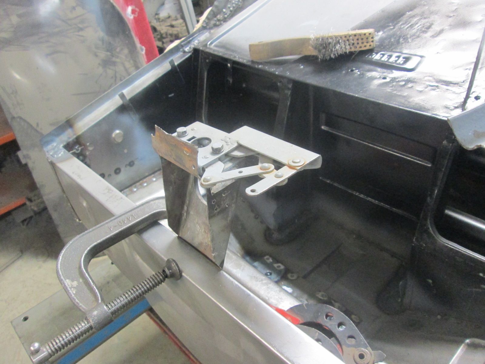 Click image for larger version  Name:	IMG_0397.jpg Views:	0 Size:	177.5 KB ID:	114205 Had to really crank on the hinge to get the bottom of pocket to come back forward but I got a hasty tack weld on it before it could spring back. I'll clean all this up later.