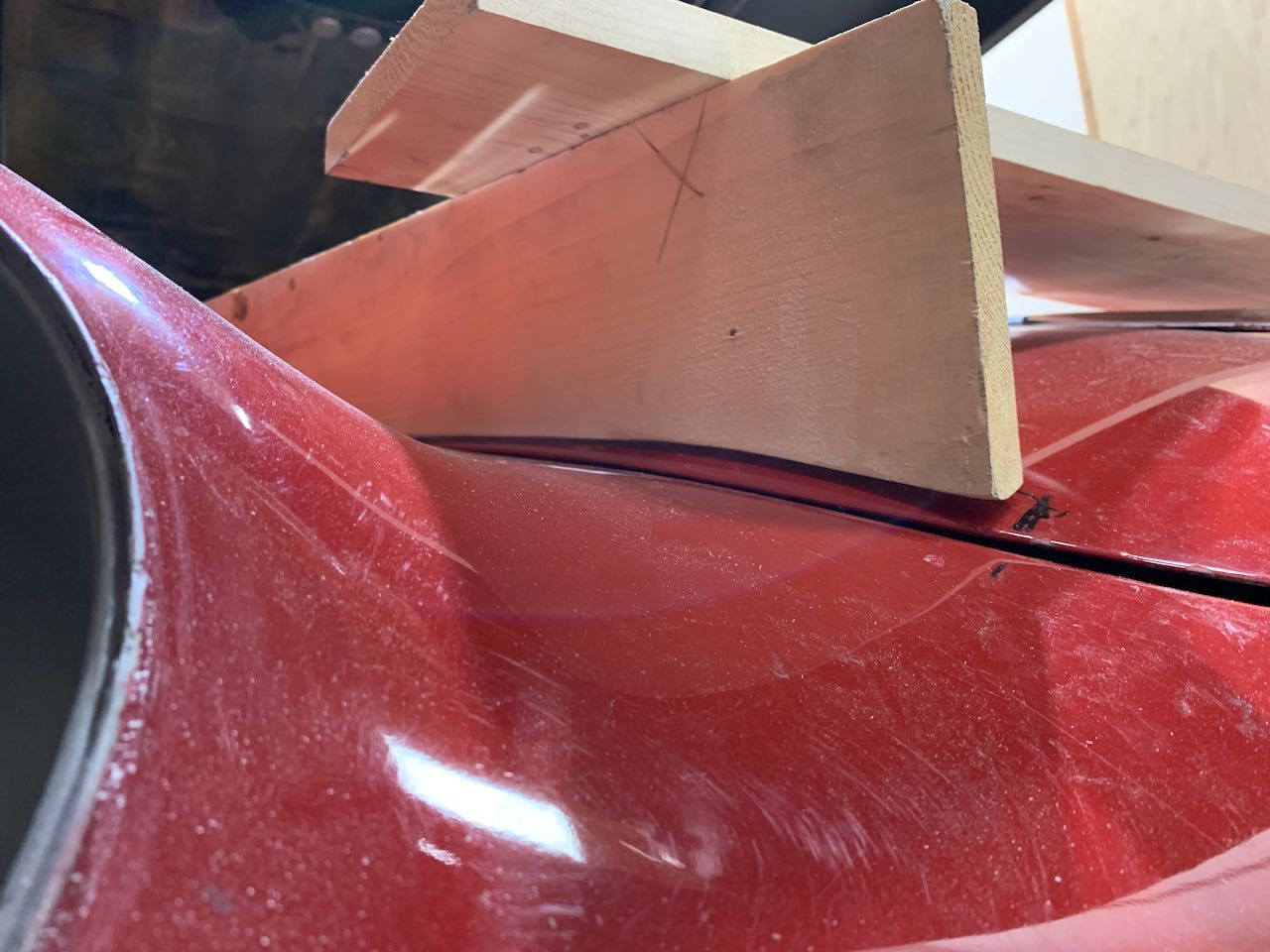 To use the templates, first I cut the metal support frame of the hood as shown in the photo above and clamped it to the templates, then tack-welded the cuts. The first attempt was encouraging, but the hood had some twist. Next I tried two things: I added wood supports to join the templates into a cradle, put a clamp on the hood diagonally to counteract the twist, and went through another iteration of cutting the tack welds and re-tacking. This time the results were really good but the twist went the other direction and the right side needed some correction on the contour . Had to find the sweet spot for the diagonal clamp.