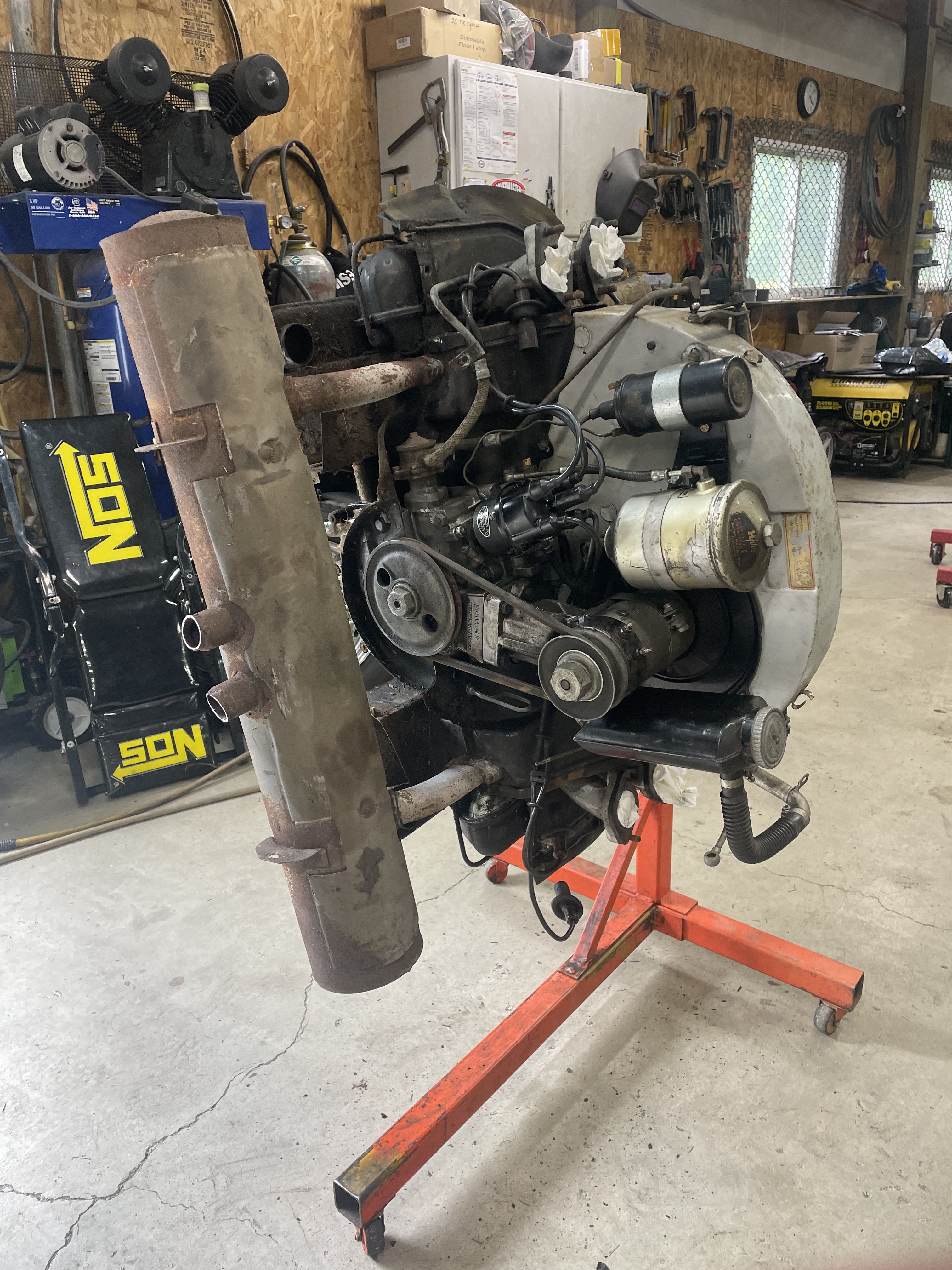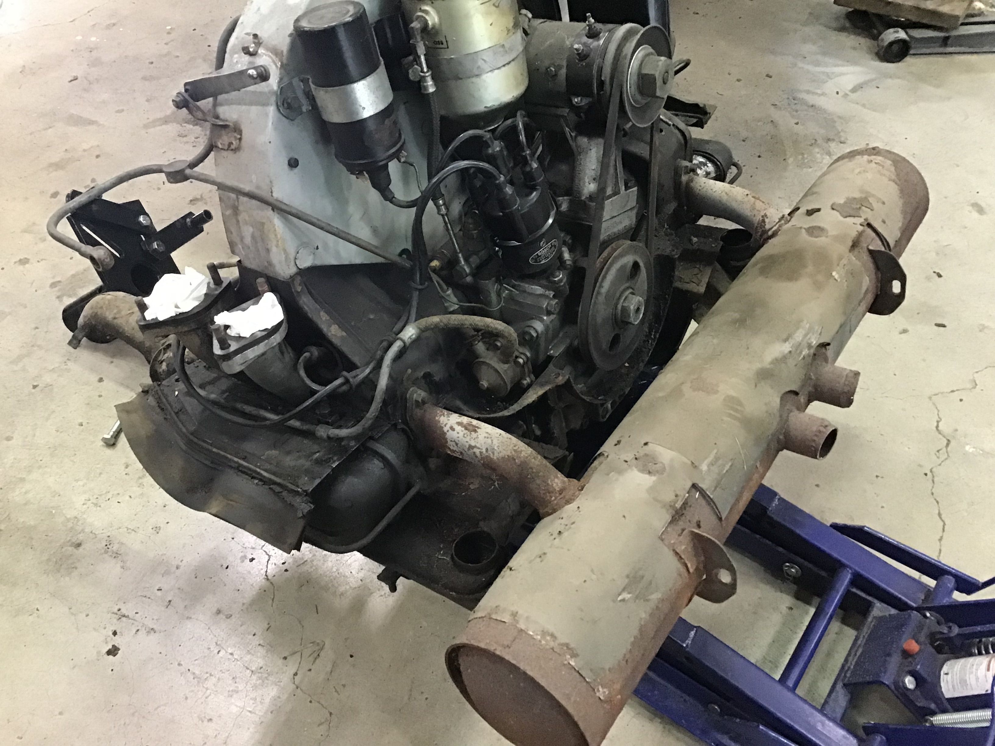We were going to drop the engine today, an hour right, be done before lunch. Dominic disconnected the heater cables, fuel line, bottom bolts we were ready. Not so fast. The J-pipes out of a OEM muffler were replaced by a pair of nicely bent 1-1/4” iron water pipes welded to the muffler. So remove the rear bumper to give us some room, but still not enough clearance. So we chopped them off. They were well done, but to get the muffler off you would need to remove the studs on #2 &#4 cylinder heads and still have 15mm to slide the muffler back to disconnect #1&3 exhaust pipes. Nice work around for the four OEM pipes. But fabricated in place, not thinking or having removed an engine before.