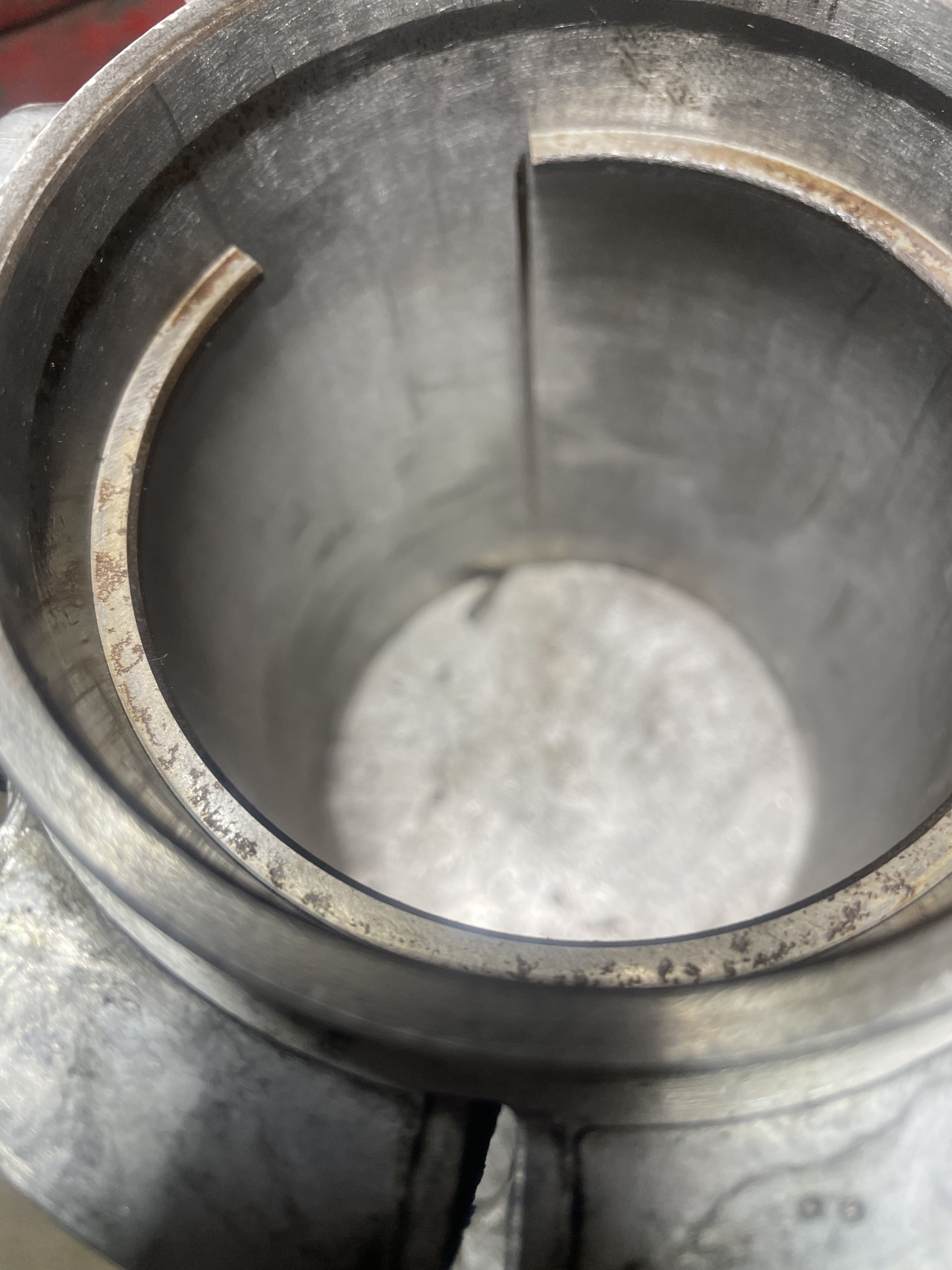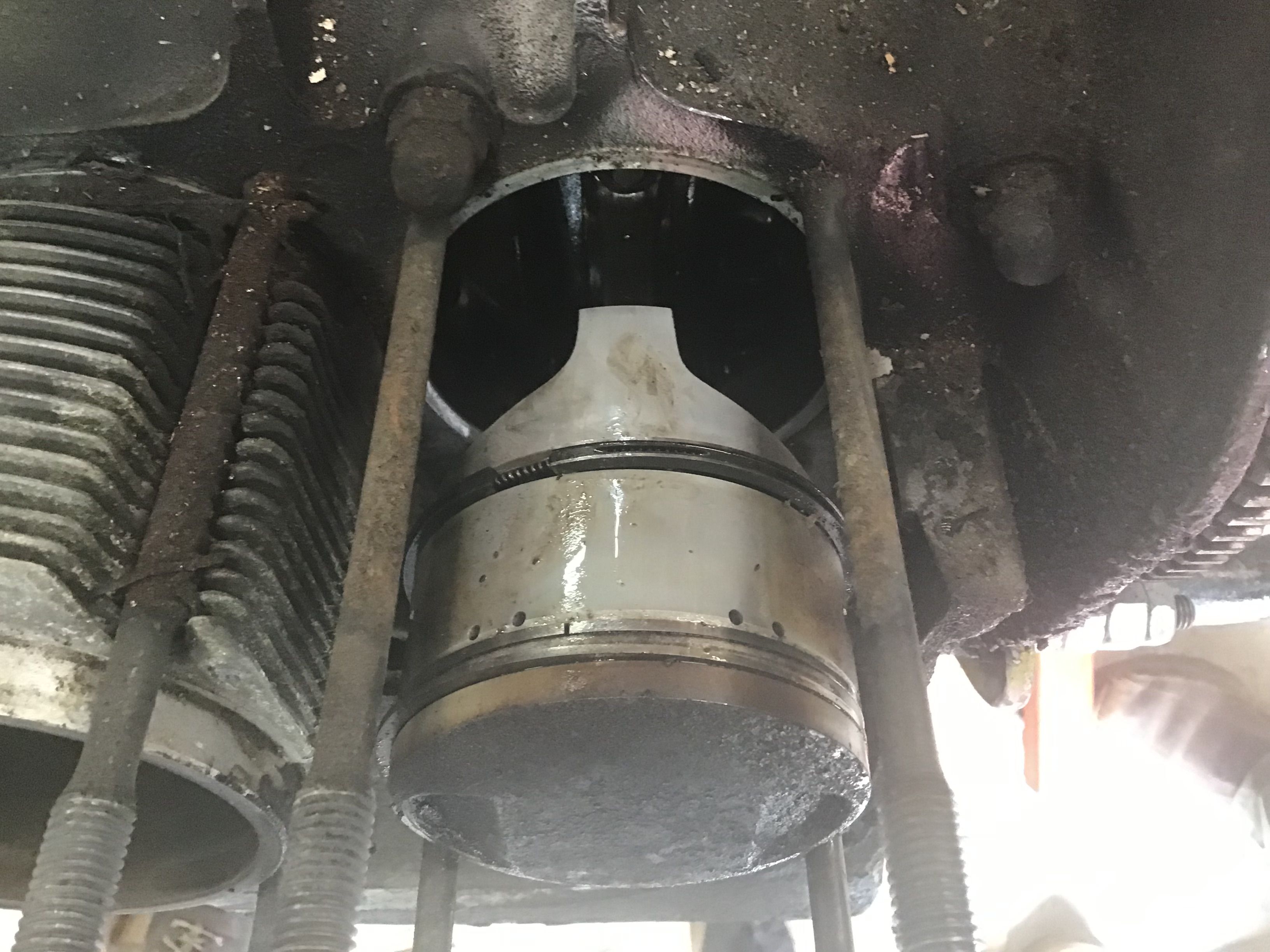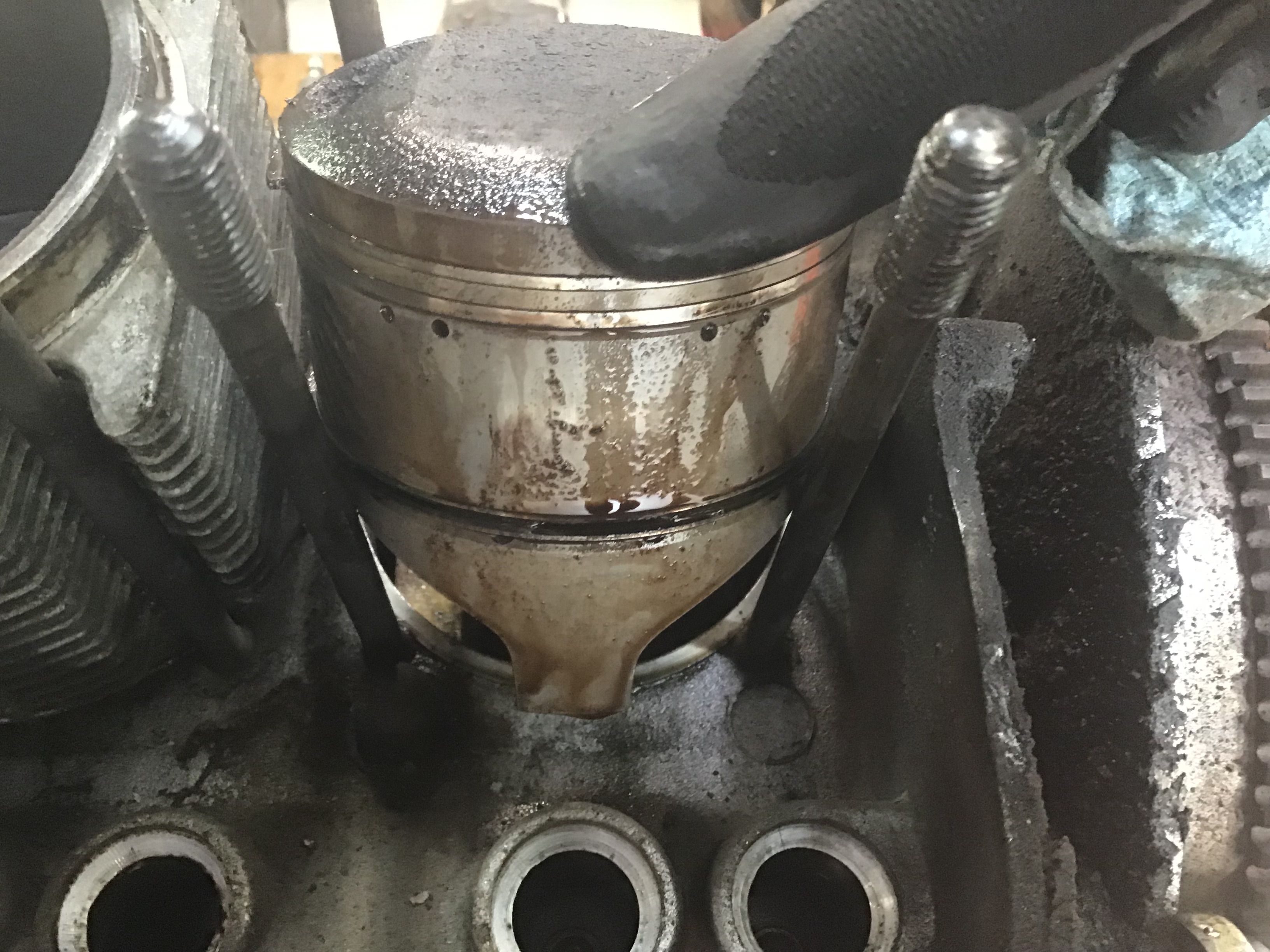 The crank moved!! After a four day soak it finally freed end up and the crank moved. We pulled the heads, not cracked that we can see, ZYGLOW will tell more. Pulled the cylinders and pistons (mahle) they all showed the typical deterioration from long term inactivity.