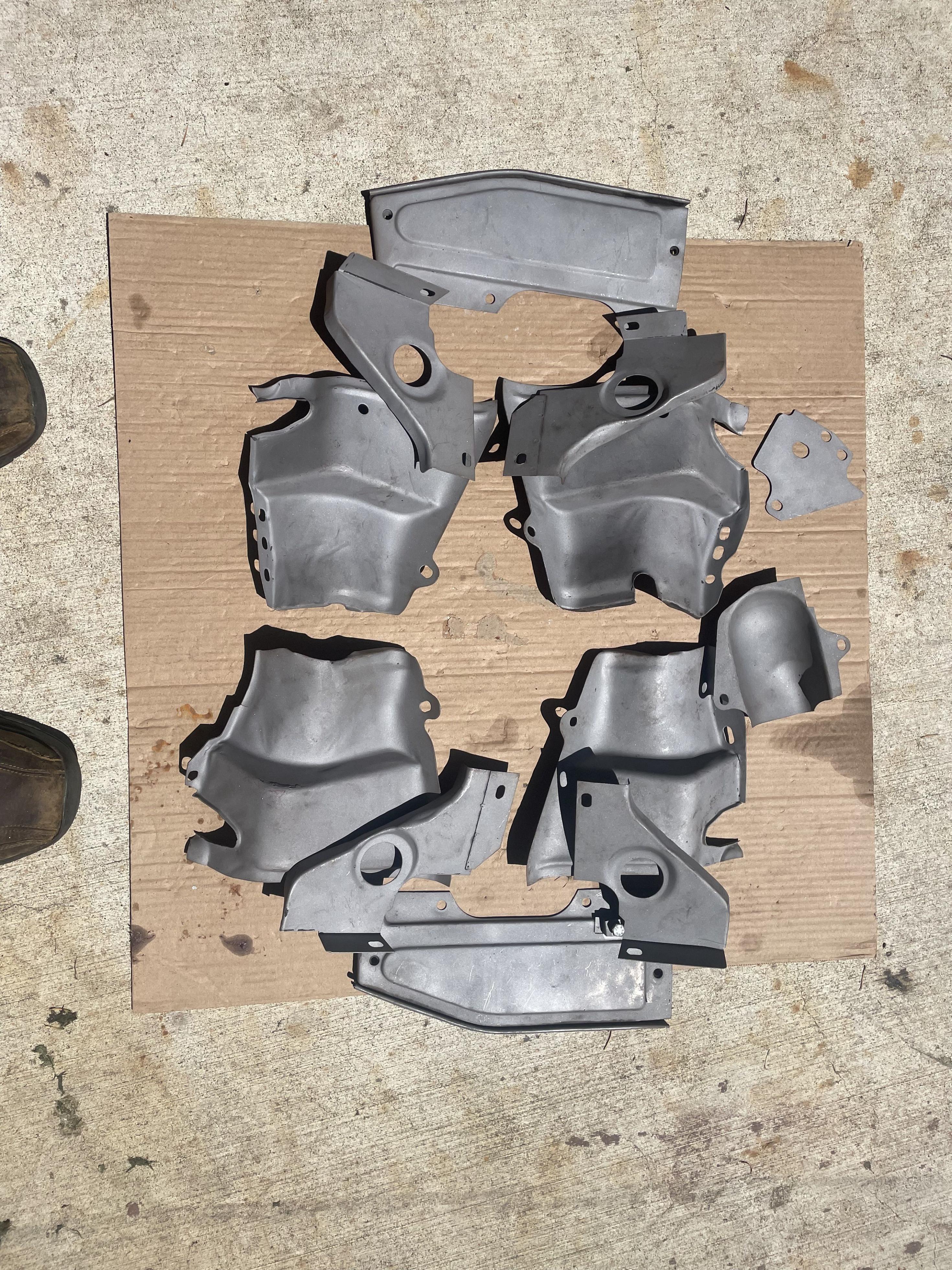 Day one, removed frozen calipers, not too hard. Removed the carbs, frozen throttle shafts on both. Removed the rear engine tin,. Only 10 cheese head screws…. Right. Well I finally met shroud screws that were almost smarter than me. Four (4) hours, acetylene touch to heat 6 of them. One guy holding down the screwdriver the other turning the driver with a wrench. Toughest cheese head screws I have ever seen, including sone that spent 10 years outside under a tree. The tins looked good from under the deck lid, underside is a disaster. Thanks for looking