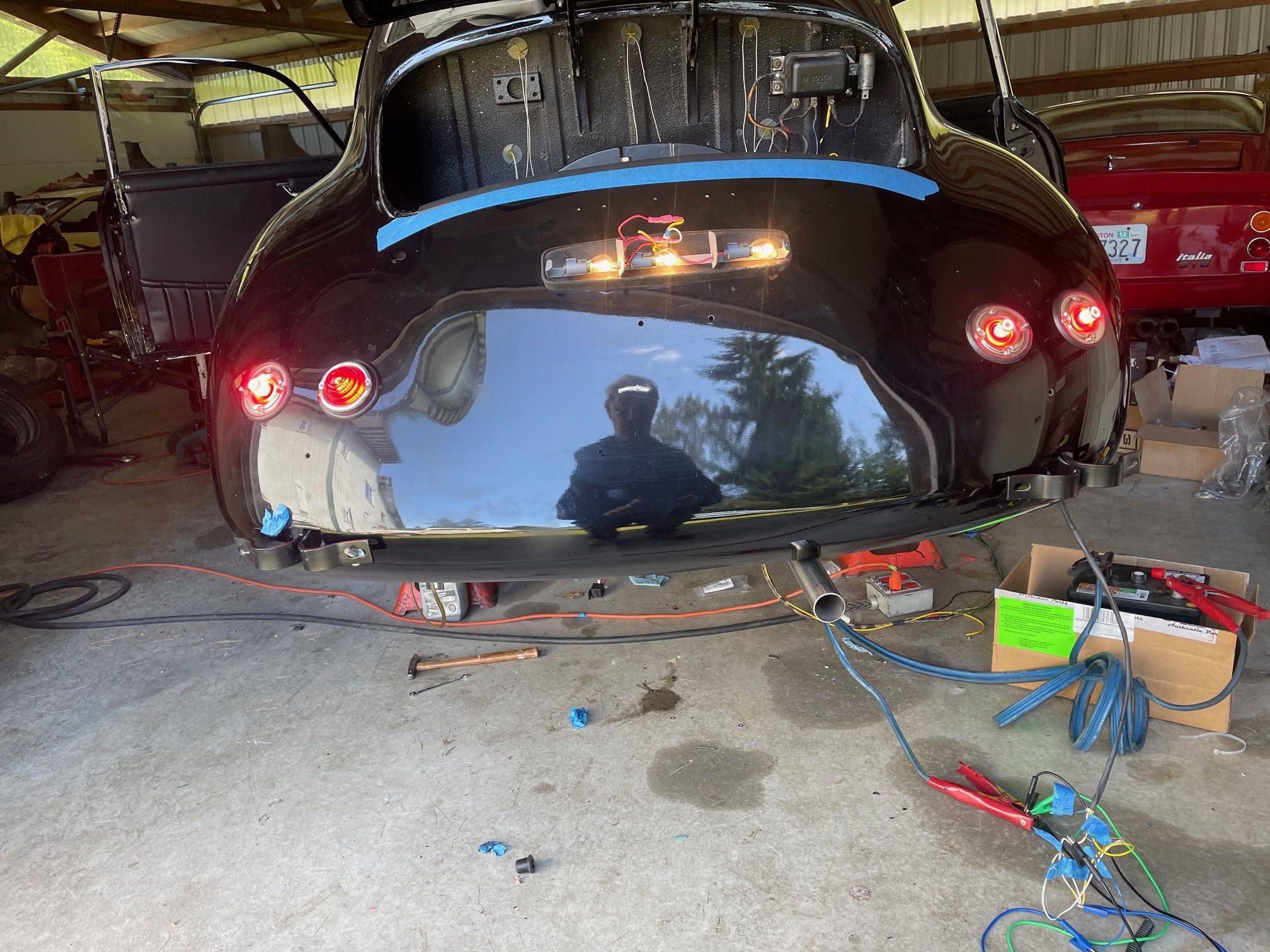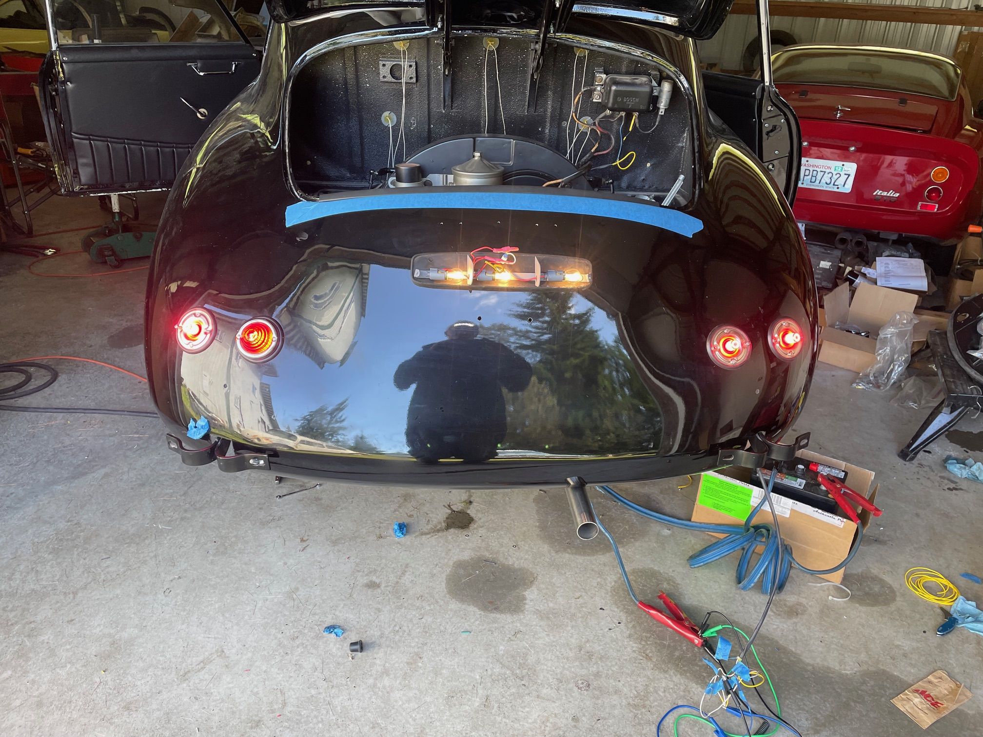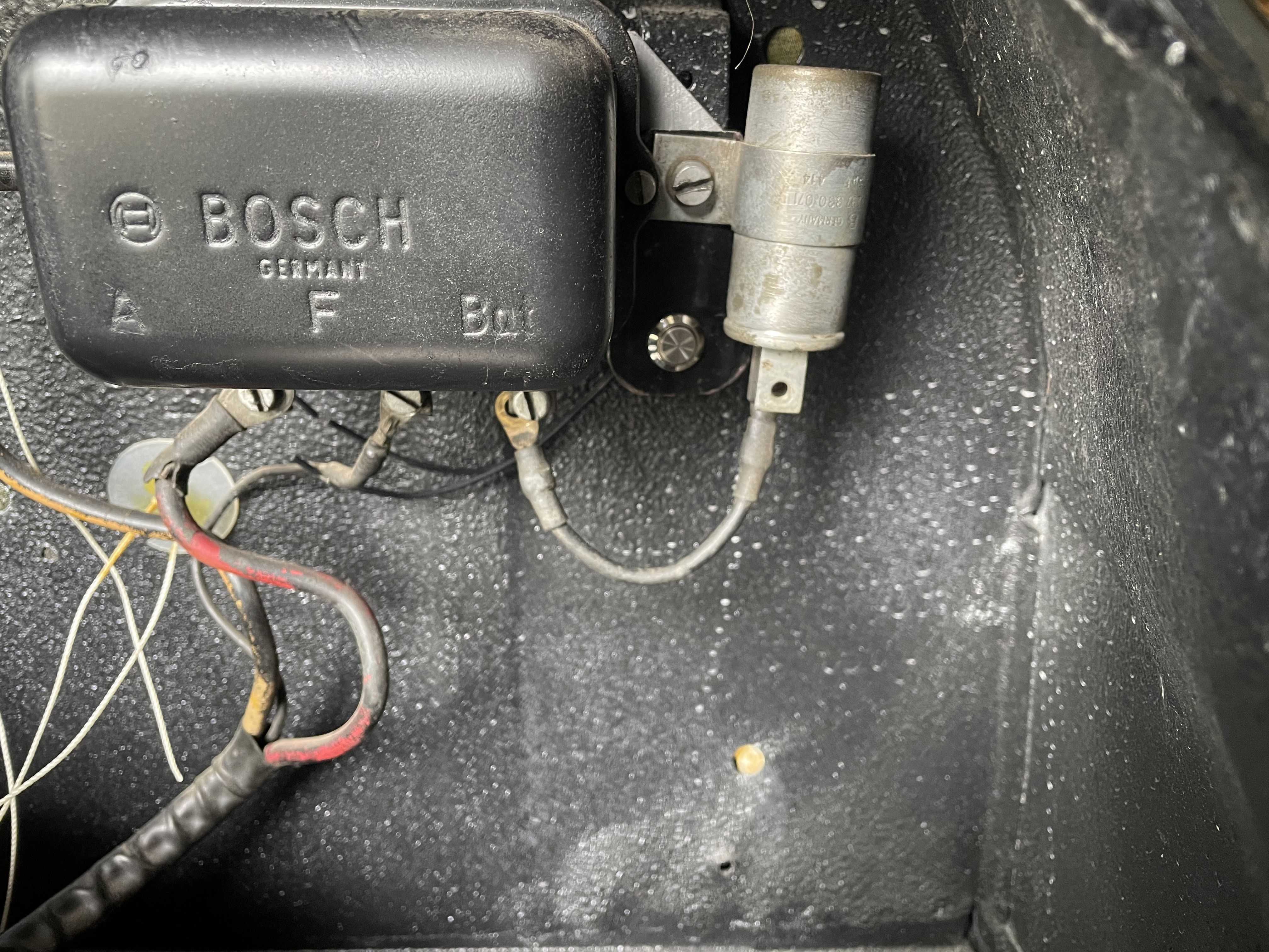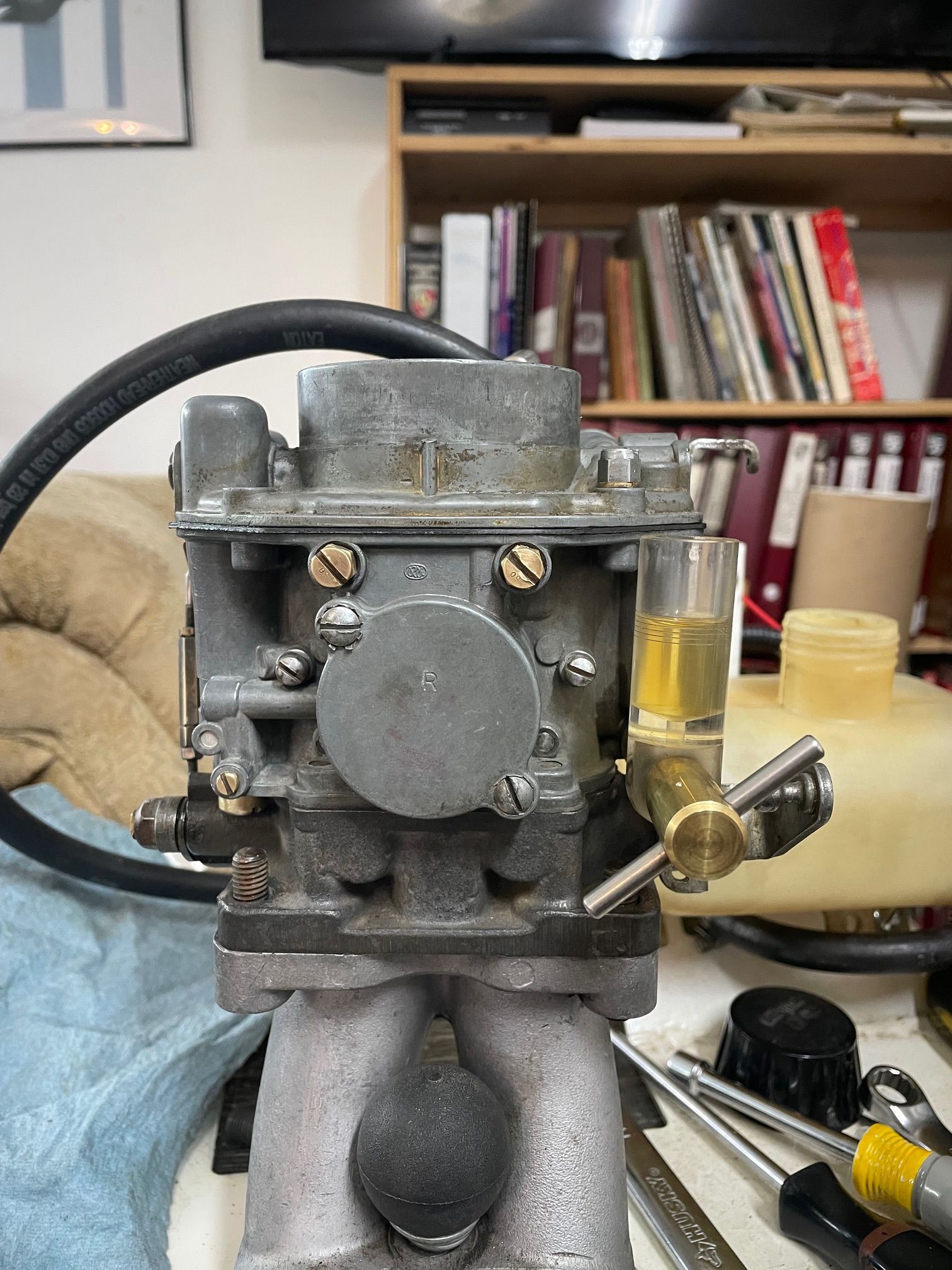 Spent the morning heat shrinking and re routing the rear harness. Installed a remote starter switch for maintenance and hard starts. Just a simple 12 mm marine momentary switch next to the voltage regulator. Wire from Batt on the regulator, through the switch to the 50 spade on the starter solenoid. I will also install a hot start relay on this one at the same time. So both the key switch and the button power the coil on the relay. Simple and should be done on all the 356’s. On a funner note today, rebuilding the carburetors. went through the dip. then the ultrasonic cleaner, and blow out the passages with air. I reassembled them, they looked very good, went to leak check and set the float level . I leak check by putting 20cc of gas in the vent tube, and let them sit, then look for shinny or wet spots. Then I run the pump and fill the bowl an check the level.