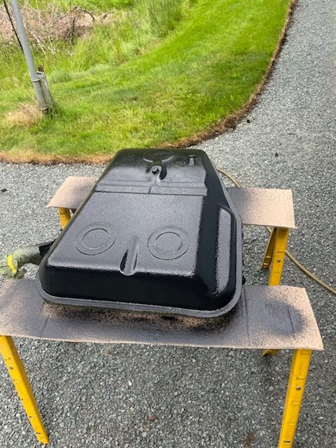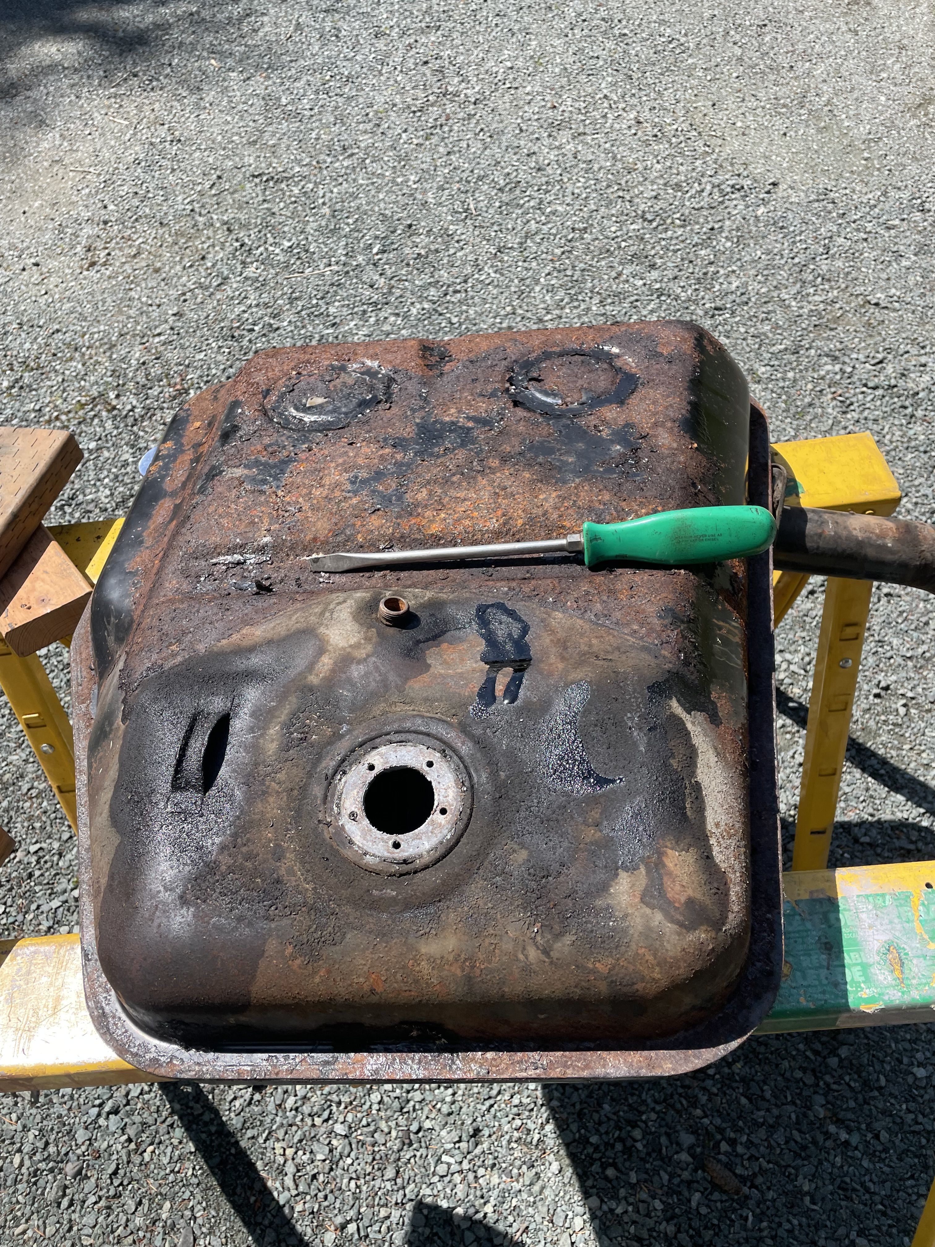 Had an occasional gas smell in the garage. Did an inspection, fuel cock was damp around the inlet. OK rebuilt, new fuel line, vent hose, it seems good, but I did noticed some tar stains under the shelf. Then a few days later we filed the tank, and the smell returned. But this time the tar was wet. Ordered a new tank from Stoddard, a C top sender, new seals etc. Took out the old tank, bottom surface was wet. Had a pin hole in the bottom, intermittent leak only when the fuel was higher, it also had a gas smell on hard left turns. We always thought that was the cap. Turns out the vent tray had need leaking for years are the bottom of the tank, and the rubber seal on the neck had rusted out also. Inside is bright and clean, outside was disgusting. So anyway, T-6 bottom sender to top sender conversion was the best option. Spliced in a couple feet of new wire from the original harness. Drilled a hole in the steering box cover for the new wires. And put in the tank. Works well. Removed the original jute sound deadening, replaced it with Optpmat tar sheet, conformal fit via heat gun and sealed up the area. Put two coats of Raptor truck bead liner on the bottom of the tank. The installed the new tank. Worked fine,.