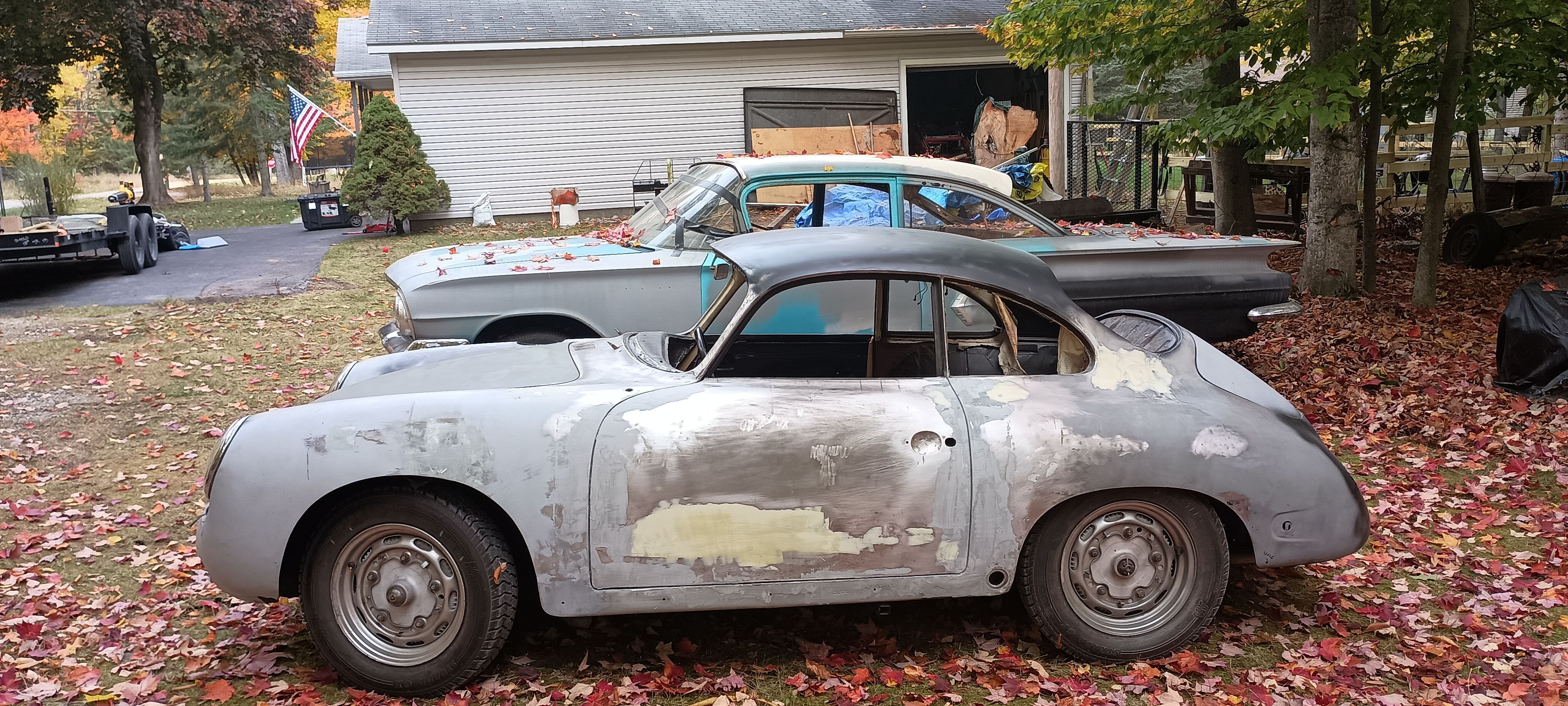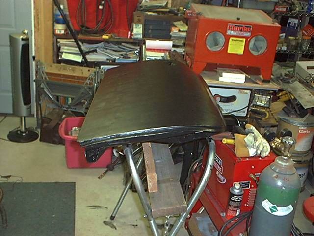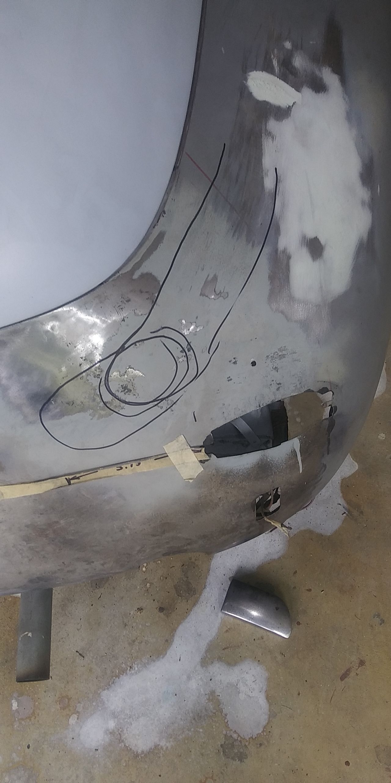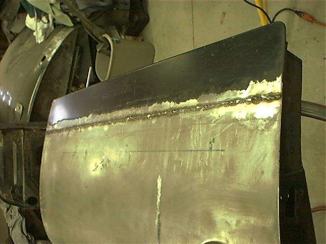 I did that during a moment of frustration a few years ago. In the pic after black primer above you can see the waviness along the weld area. This was primarily caused by my lack of knowledge at that time of how to properly mig weld and planish on outer panels. This and the drivers door were done the same way. You can see the long proud weld bead in the other pic above. This was filed down pretty smooth with no planishing. So I have spent many hours this past month removing the filler and planishing the complete weld area. This has smoothed the metal up fairly nice and also reduced a low area caused by weld shrinkage. I did the same to the drivers door quite a while ago. Will post pics next time in shop.