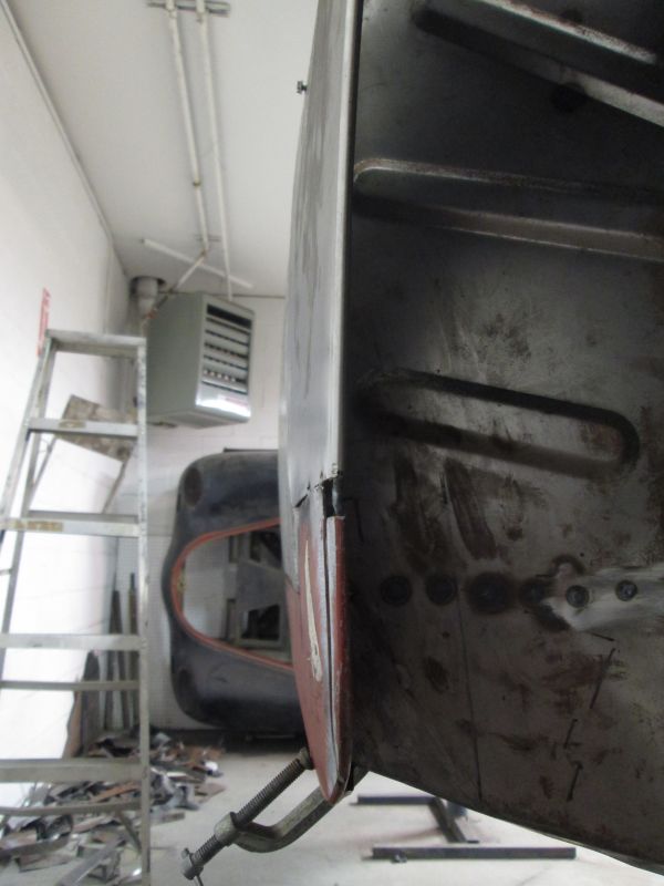 With the front pretty much set I moved toward the rear. I left it loose so I'd have a chance of an emergency adjustment in case the fender shape got away from me after tacking it to the nose. The back was sagging on me a bit at the top so I had to get out my floor jack to preload it into position to get my body line with the top of the door back.