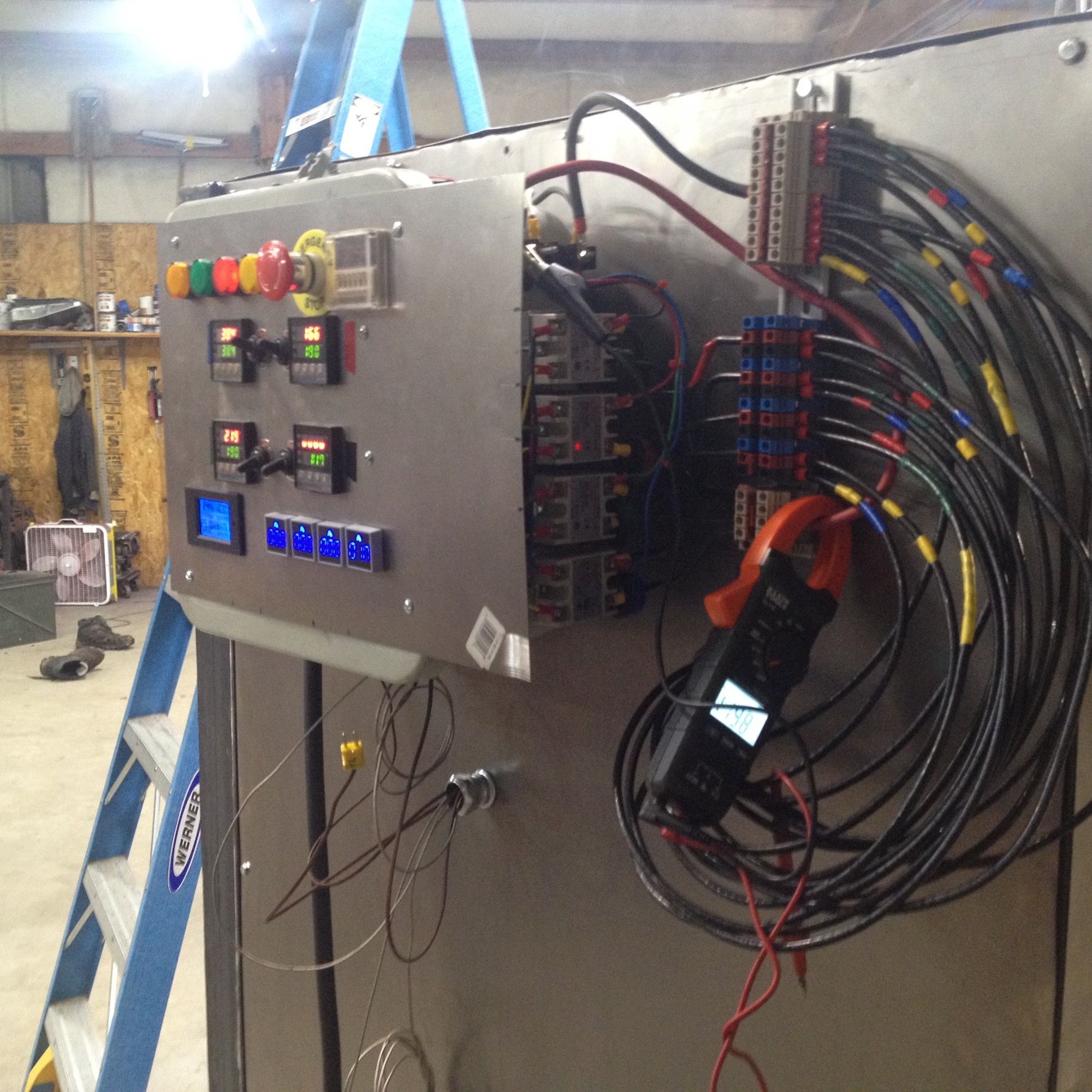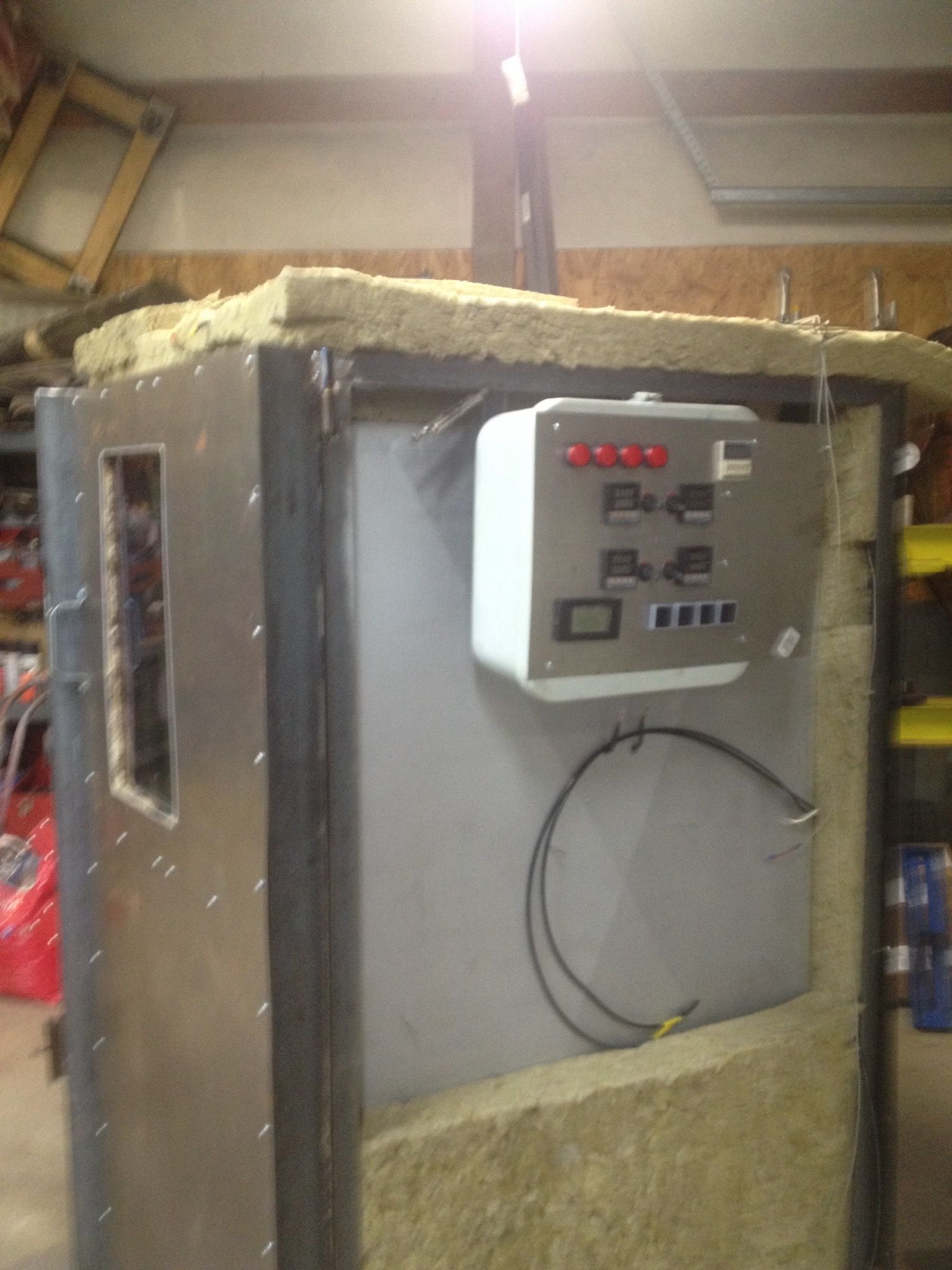 The oven is done.. it was a long journey but it works well. I for the inside temp up to 225C in 20 minutes and only used 2930 Watts. Then I opened the doors for 30 seconds and internal dropped to 175C but went right back to 225 in about 5 minutes. It draws about 25 amps to start but when its get close to temp it drops down ro 3-5 amps. each SSR comes on for a few seconds and cycles. Having four separate selectable controllers is the trick for controlling the total electrical load. I wired them in pairs on opposite walls.
