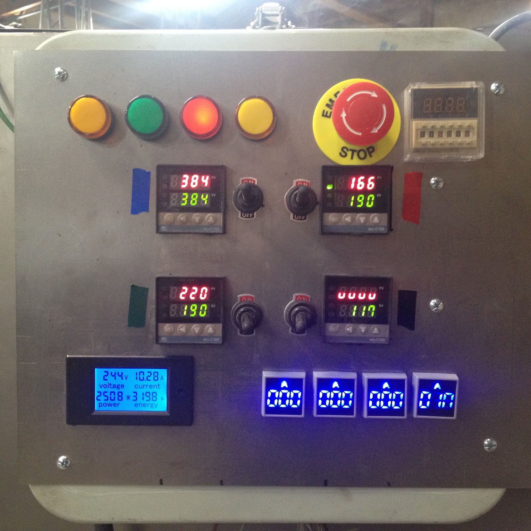 I started the calibration today, Goes to 350 F in 6 minutes, with 2000W of power consumed. The meter in the lower left corner is power meter (volts/ amps/ current watts/ total watts) with a Pearson Coil (CT) monitoring one leg of the 240V in. Each of the SSRs also has a coil to monitor the current on each leg, displayed on the square row on the bottom. These all add up and equal the big power meter. I also used a clamp on multi meter and they all agree. The four lights at the top come on as the SSRs outputs to the heaters. They blink on and off at when you reach the set temp. . Most current draw seen was 18-19 amps. Once it gets close to the set temperature, the SSR start to pulse and the current drops to about 3-8 amps to hold 350 Deg F.