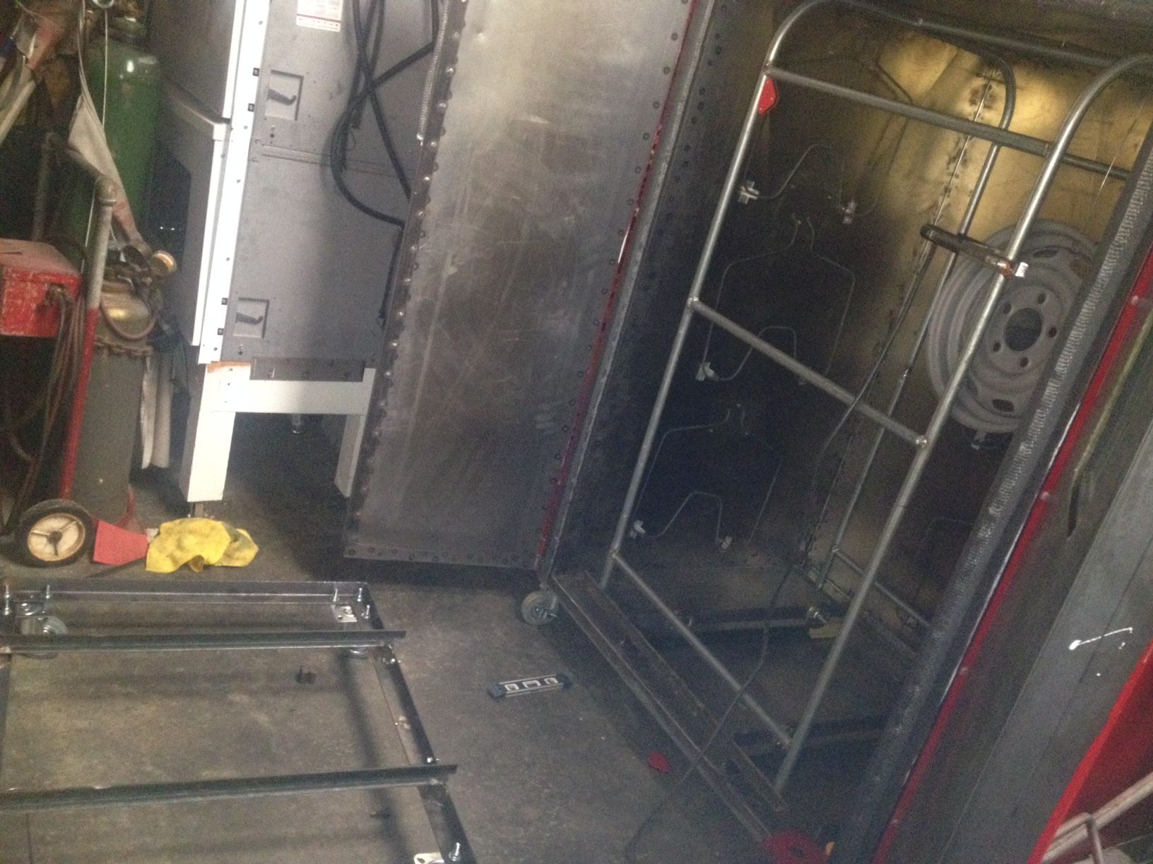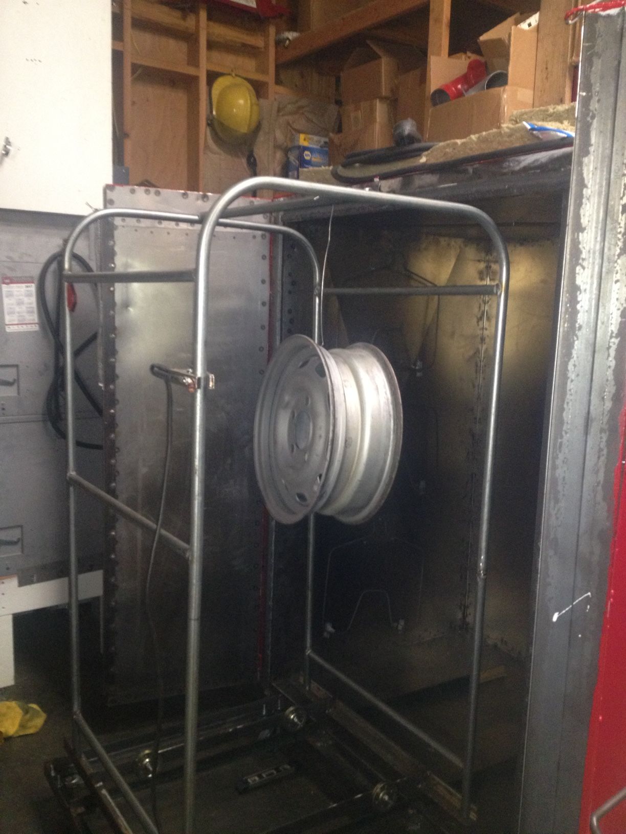 The power coating oven now has a rail road system to move the parts in and out. it as car that sits on the floor and a car has rails to move the carriage with parts into the oven.