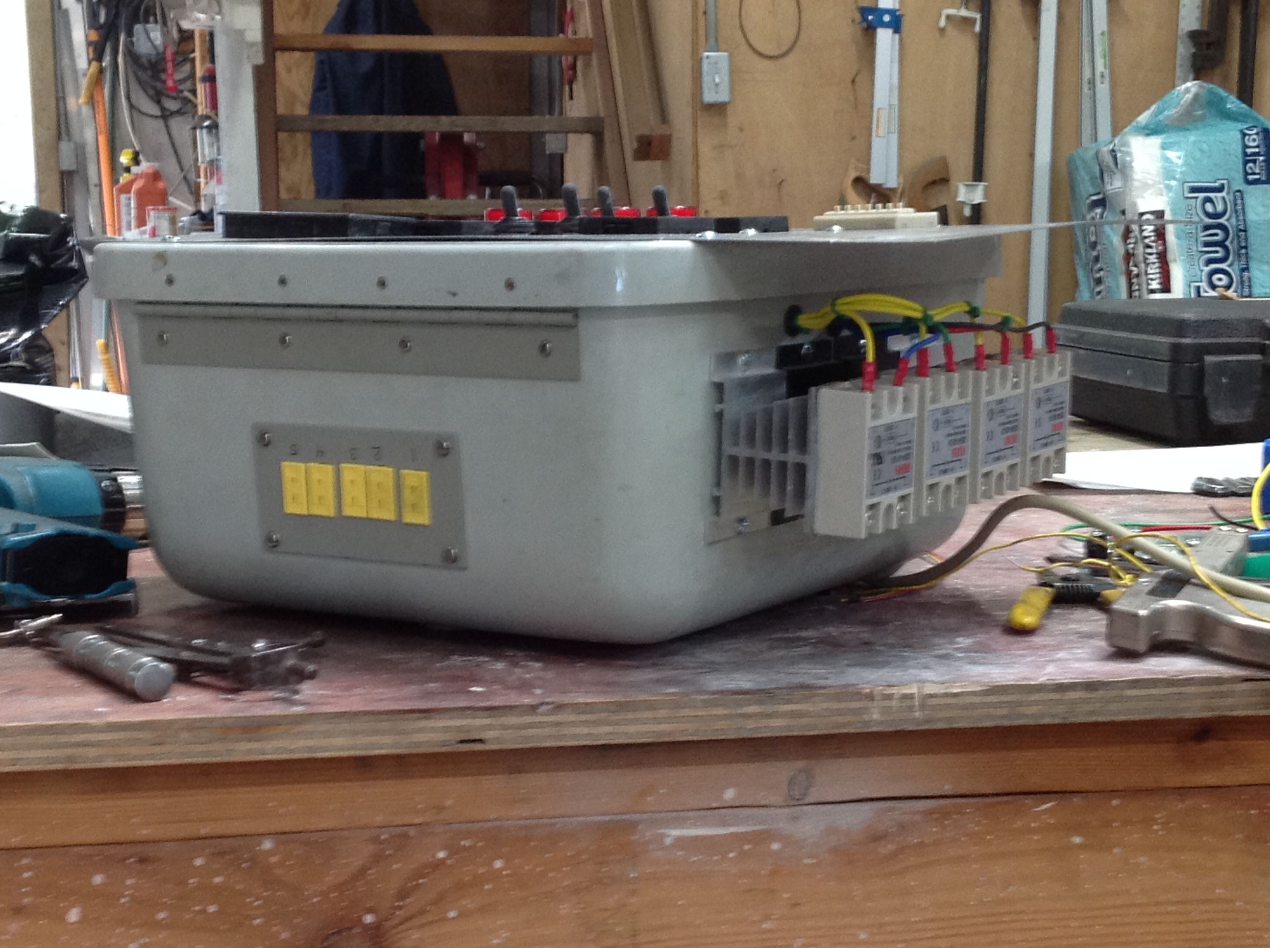 More more wiring for the control box. All seems to work as planned, TC plugs in the bottom, solid state relays and heat syncs on the right side. Couple more switches and ldiot lights to go