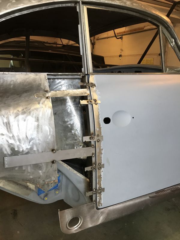After getting the door and window frame gaps set I cut the lockpost in half and installed both pieces in their best positions. I then welded metal strips on the inside and outside of the car to hold them in place.