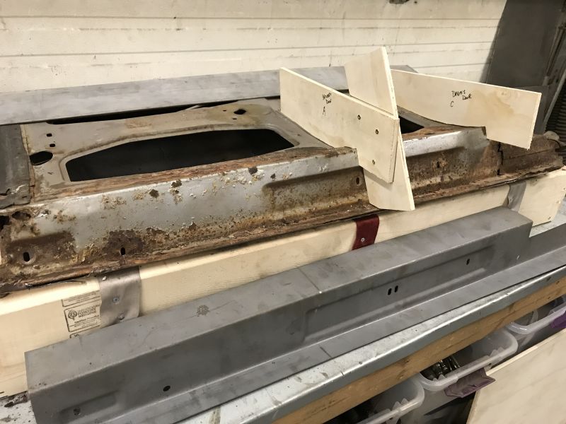 Continue to dig into passenger door. Made a jig to reposition the lower door hinge once I start cutting out the bad metal.