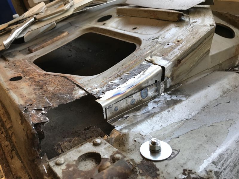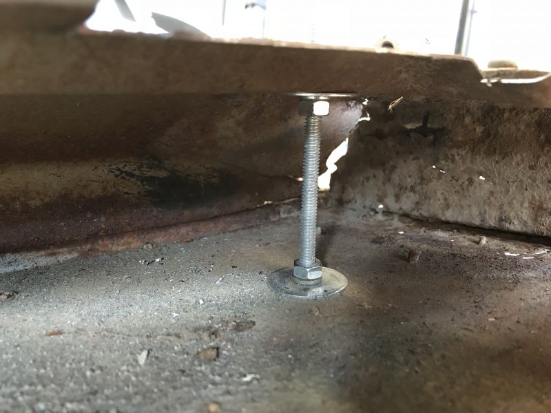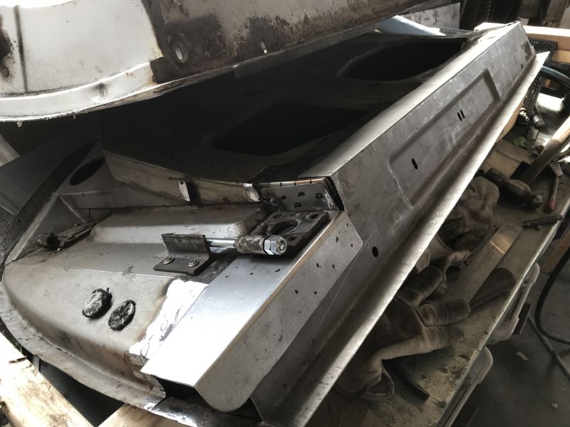 • Taking a break from the bottom piece for the passenger door to think about how to get it to fit better. Started digging into drivers door. The bottom hinge is weak so I braced it with a threaded rod that is bolted on the outside and side of the inner frame and outer skin ( four places where nuts are positioned. Nice and strong and snug to keep it in position.