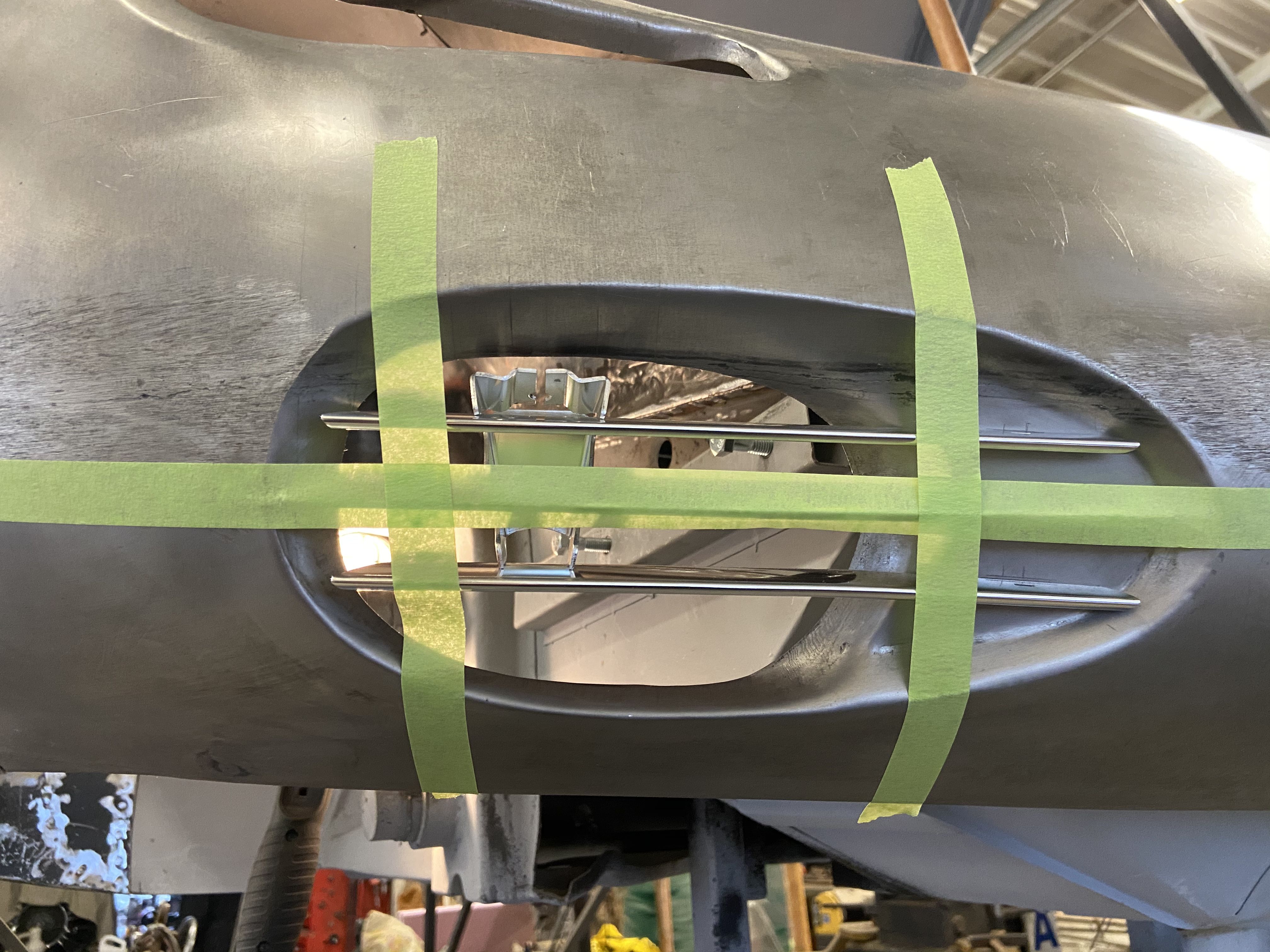 Took some time to position the front nose porsche script emblem. Tricky finding correct placement but got it fitted. The next challenge was putting in the backer clip plate. This is no longer available so I had to recreate. I used a piece of metal drilled out for the emblem pins but large enough to allow the metal fasteners (pal clips) to set inside of the hole with a bit of movement. They were lightly held in place with screws to properly position them then overlaid the metal strip and then welded in place capturing the metal clips.1960 356B T5 - under major resurrection.