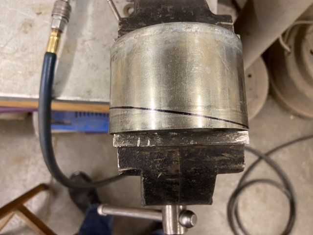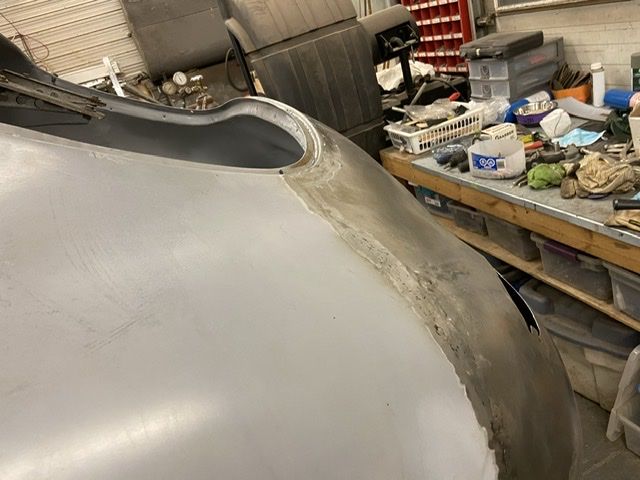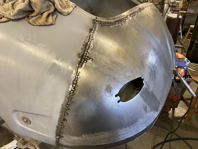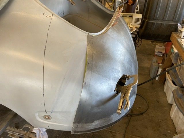So I ended up slicing through the original seam. The metal needed some shaping a bit as the curve was more than needed. I then clamped it back on and allowed the two piece to overlap in position. I then tack welded the pieces to together and then took little slices out to butt seam and weld slowly up. I think I have gathered enough metal up to make the left side work now.