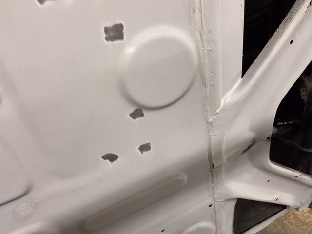 • Panel all prepared and in final position. Tacked in place - no turning back now - slowly welding trying to control the heat. Click image for larger version