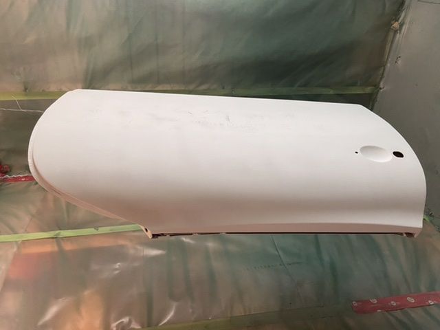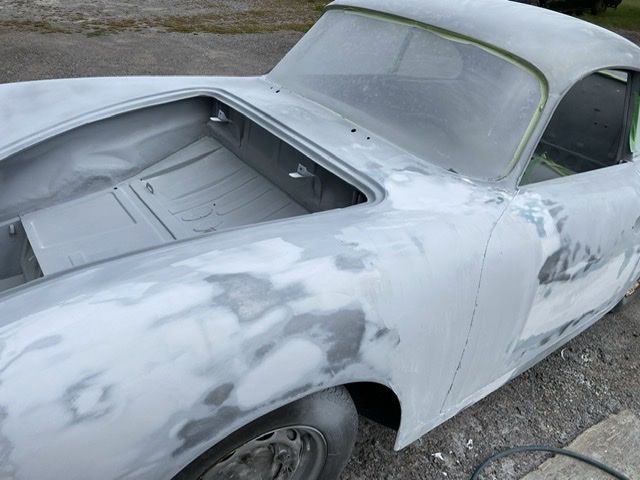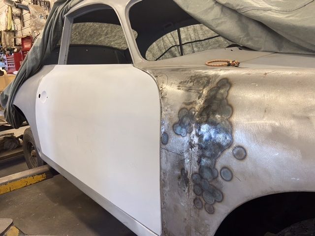 Few steps forward and a few steps backward. Starting on body prep now beginning with the doors. After taking a good look I was not as happy with the leading I did in the joint originally. I was not a hundred percent sure the lead had solid adhesion to the door skin. So…. I ground out much of the lead then media blasted the doors again - just as well as there was some evidence of rust in the door metal scratches that would not sand out. I then filled the seams with kitty hair resin body filler. Three applications with grinding between each session got me 90 percent there with the doors. I then recoated with 2 part epoxy. Doors are back on with some final latch adjustments still needed.