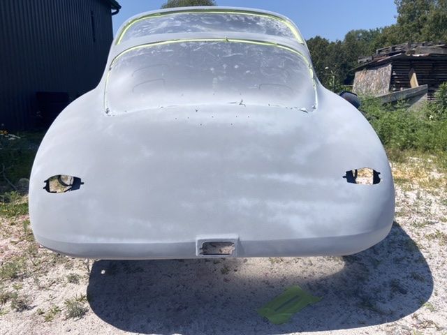 Well it’s on to the body work when the humidity is at a reasonable percent. With wheels on the body it’s really handy to roll it outside for body work to let the dust blow away outside. It’s been a while since I welded on the body panels so each time I do a section i need to media blast again followed by some cleaner. Tackled the rear first using fine kitty hair filler to tackle the seams and some of the lows to get close to the shape without a lot of shaping then sealed all the next day with epoxy to prevent any flashing on the bare metal. Happy with first rough shaping. The real work will come with finer filling and blocking.