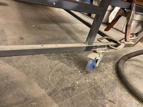 ID:	108219 I used a set of basic swivel dollies from the local hardware store and welded to a u channel that can then slide off and on the rotisserie- just held in place with vice grips for when it is in the air. I think these small ones can hold 500lbs more than enough strength when spread around.