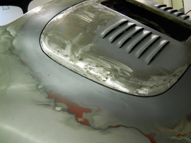 Trimmed back most of the length of the leading edge so it would clear the body as I opened the lid. Welding it back together here.