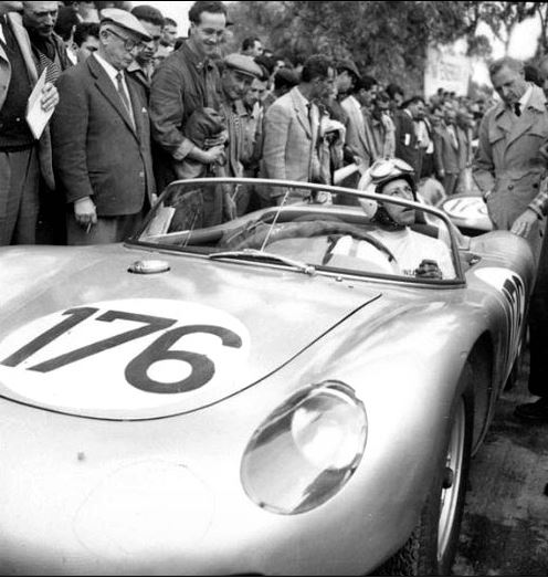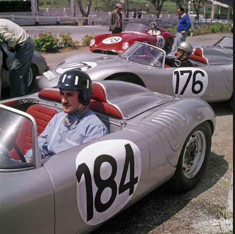 • Photo of Graham Hill in RSK 718-009 in 1960, which was used as a recce vehicle for the Targa. When I purchased this car it still had the tall screen required in 1960 by the FIA but was not fitted in 1959.