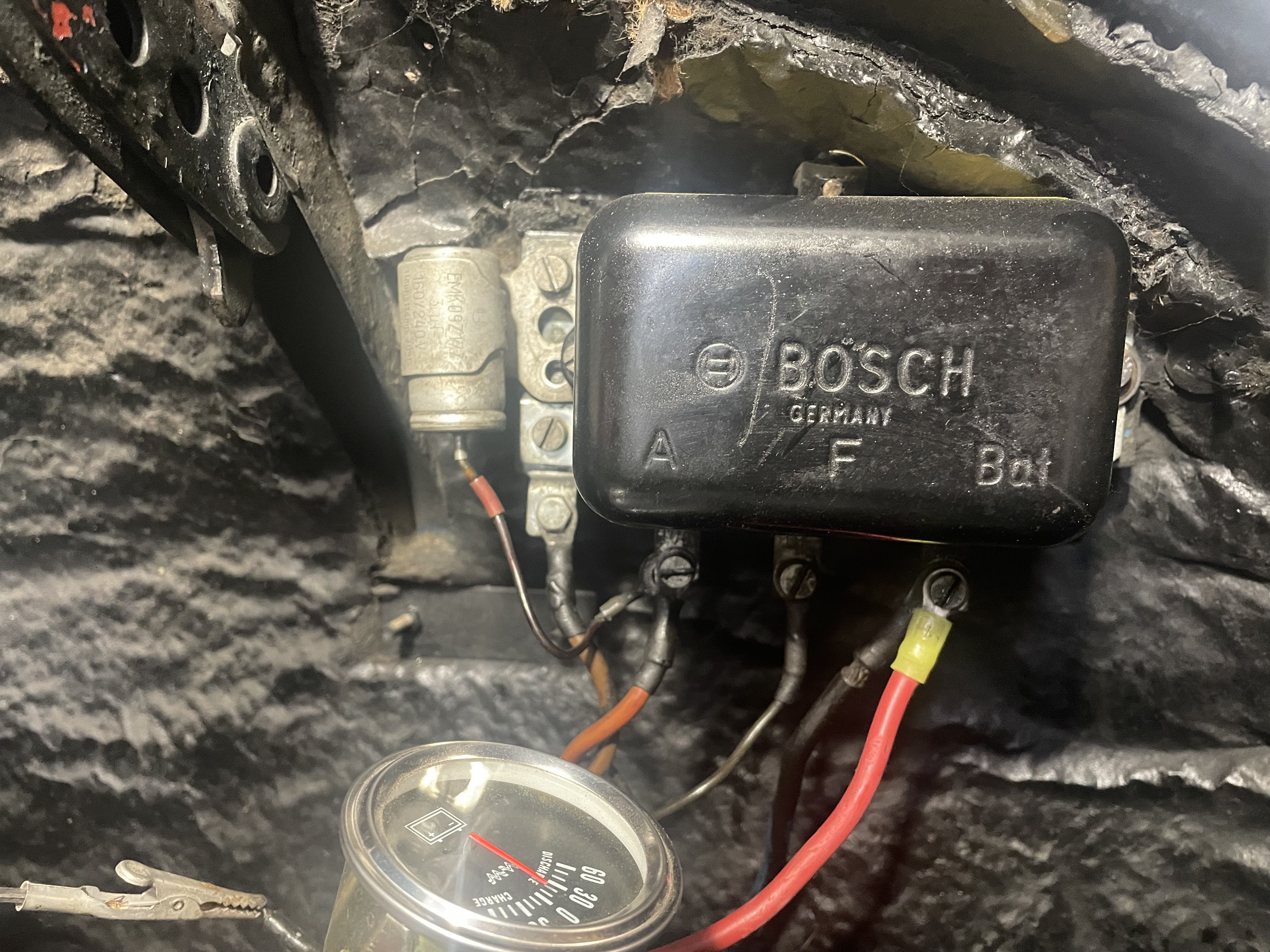 Final install, new harness, 3 wires, B+ to battery lug on voltage regulator. Ground on alternator case to regulator ground tab, just like the generator, small red wire to blue wire to generator light, Isolated, insulated. Not too hard. Thanks to Cliff Murray in Philly for taking the call, and for the text on the wires. The generator had no instructions or paperwork inside. Tom ordered it from the UK, it arrived in 4 days. This is for the small diameter generator replacement, but twice the original power out, pretty simple. Inside was mostly empty space, the actual alternator was surprisingly small for the power out.