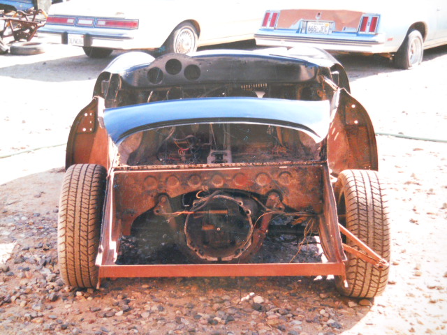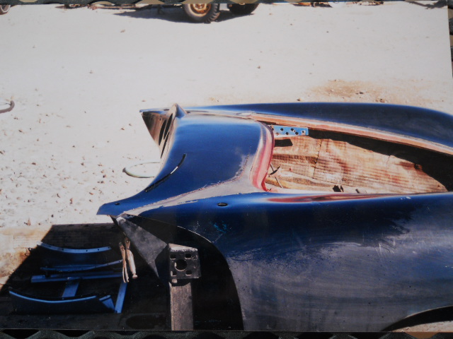 Very rough trial fitment of the rear skins. I had an original speedster decklid with Trevor's rear cowl and quarterpanel caps. I reused the original rear fenders and tail skin. Cut between the tail-lights which the Father did all those years ago. See the picture below. This actually worked-out since I was widening the rear anyway.