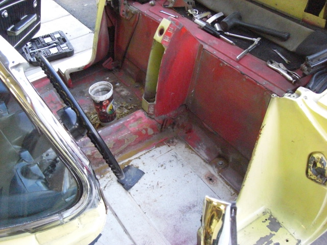 car was originally red with black interior. It was originally a 340HP car but a non-original 350 stand in motor is what came in it. Once I removed the seats and topframe to get at the tank the grime and shity overspray yellow paint proved too hard to just leave alone.